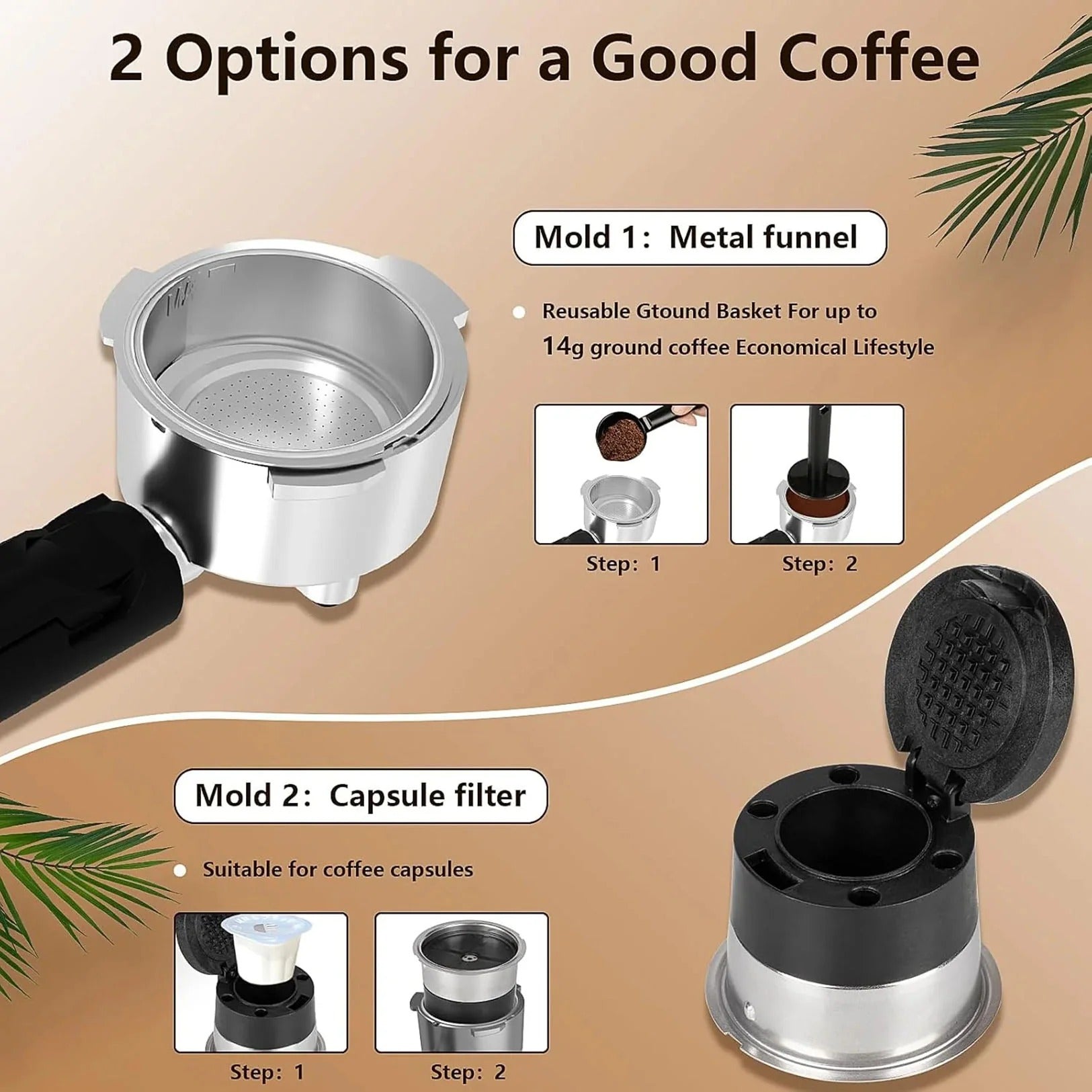 【Smart Pre-Infusion = Better Coffee, Every Time】Engineered for optimal flavor development, the machine incorporates an independent water tank and a pre-infusion system that gently saturates the coffee grounds before full pressure is applied—this helps reduce channeling, minimizes foam or splatter during extraction, and ensures a more even flow of water through the coffee puck, resulting in a higher extraction yield and smoother taste.