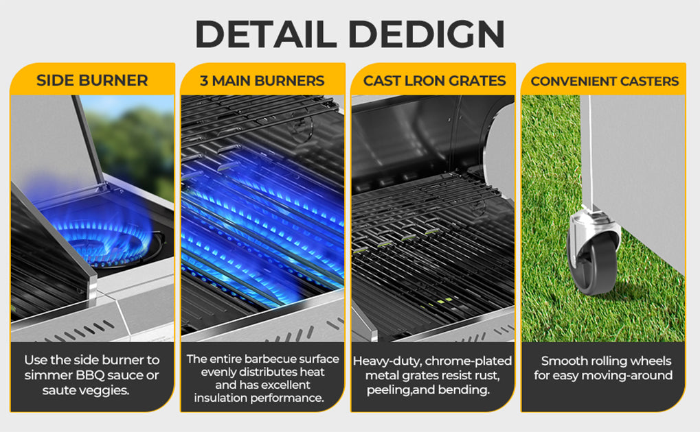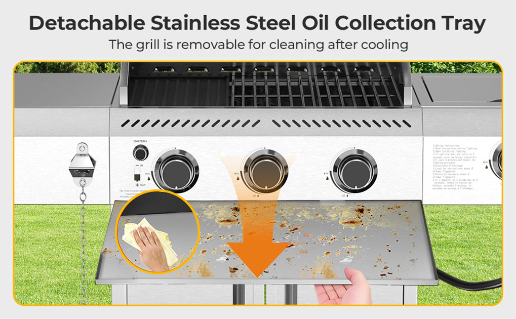 Equipped with four heavy-duty casters (including 2 lockable wheels), it ensures stable and effortless mobility on patios or decks. The removable grease tray significantly simplifies post-BBQ cleanup, allowing for quick and thorough maintenance.