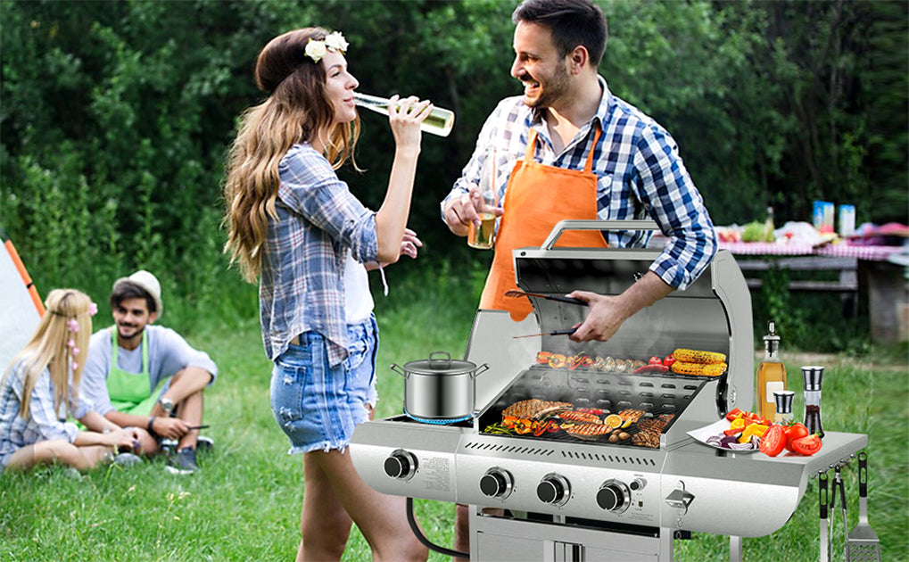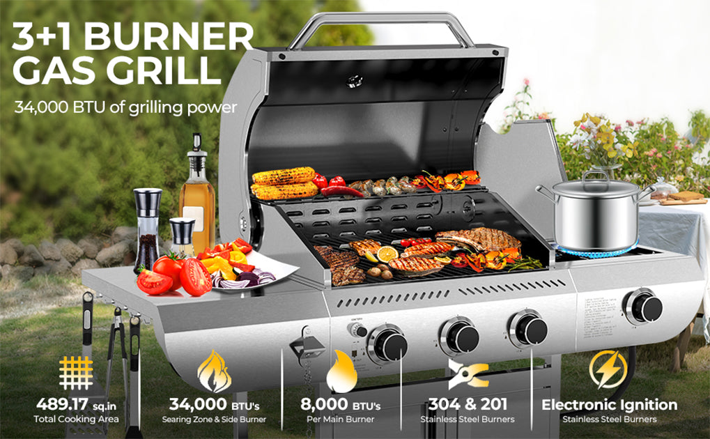 The Electactic 3-Burner Propane Grill is the ideal professional-grade solution for backyards, camping trips, or picnics. Featuring convenient electronic ignition and a versatile side burner that expands your cooking possibilities, it delivers exceptional performance for outdoor cooking enthusiasts. Boasting 34,000 BTU total power (including the 10,000 BTU side burner), this stainless steel gas grill heats up rapidly and maintains precise temperature control—perfect for simultaneously grilling steaks, burgers, vegetables, or simmering sauces to perfection.