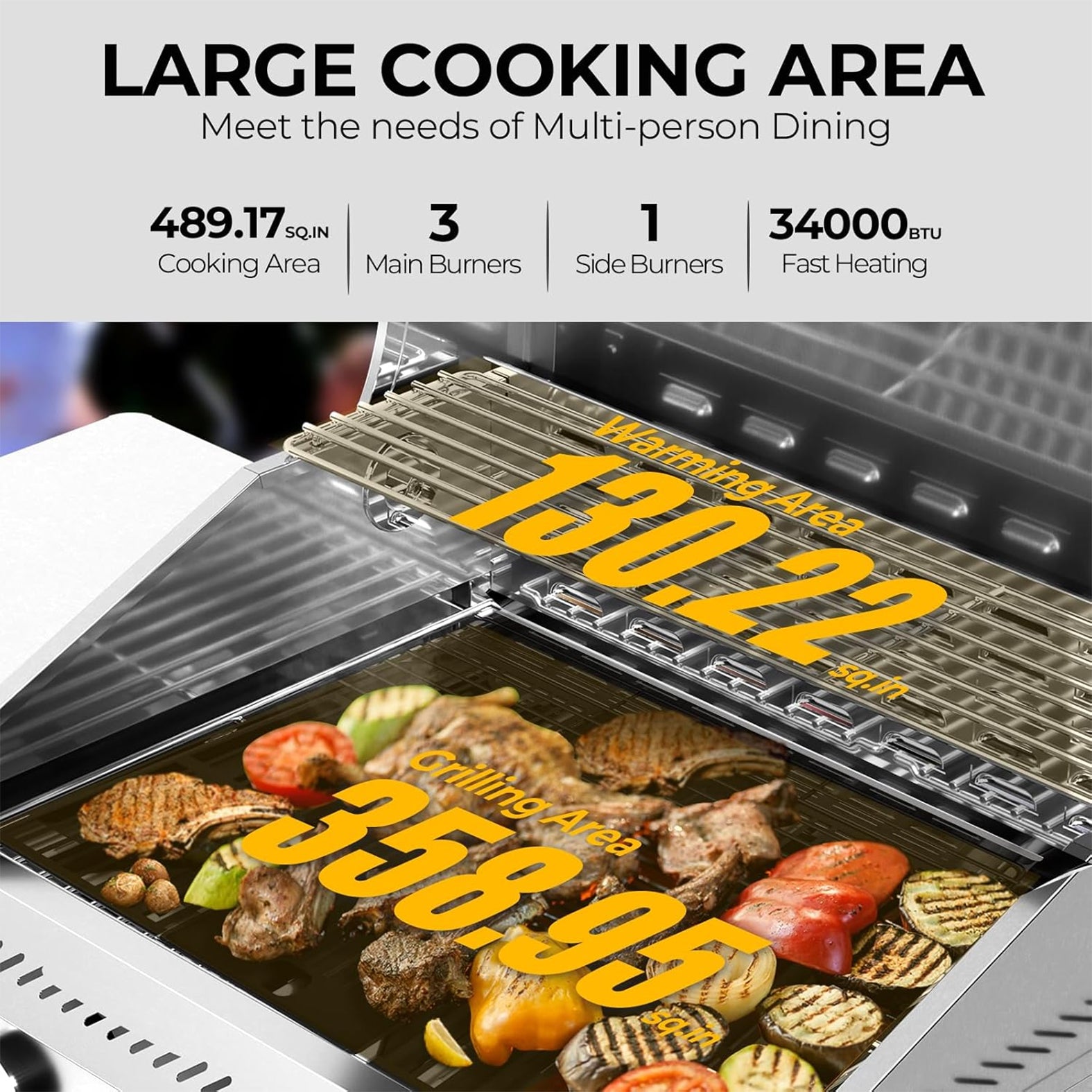 Offering a generous total cooking area of 489.17 sq. in. (358.95 sq. in. main grilling space + 130.22 sq. in. warming rack area). Thoughtful conveniences include a built-in bottle opener, side hooks for hanging tools, and substantial bottom storage, keeping all your grilling accessories and seasonings neatly organized and within easy reach.