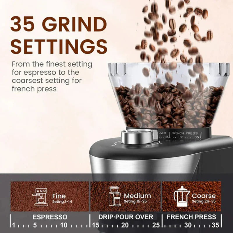 【35 Custom Grind Settings – From Bold Espresso to Smooth French Press】 Whether you're craving a rich espresso shot or a mellow pour-over, this premium burr grinder gives you 35 precision settings, letting you fine-tune your grind from ultra-fine to coarse with unmatched consistency. Easily adjust your brew volume between 2 to 12 cups, making it perfect for solo mornings or entertaining guests without sacrificing flavor.
