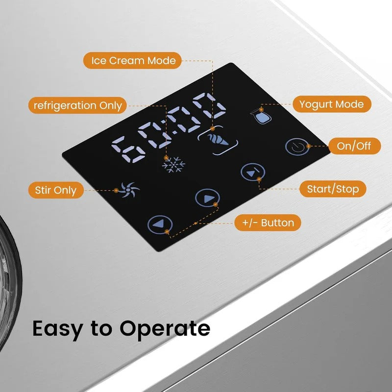 Instant Freeze Revolution: Ditch pre-freezing forever with the 180W self-cooling compressor—transforming ingredients into silky ice cream in 20 mins (soft-serve) or 60 mins (hard-packed), while yogurt/chill/stir modes handle everything from frozen custard to breakfast parfaits, making you the dessert hero any time cravings strike.