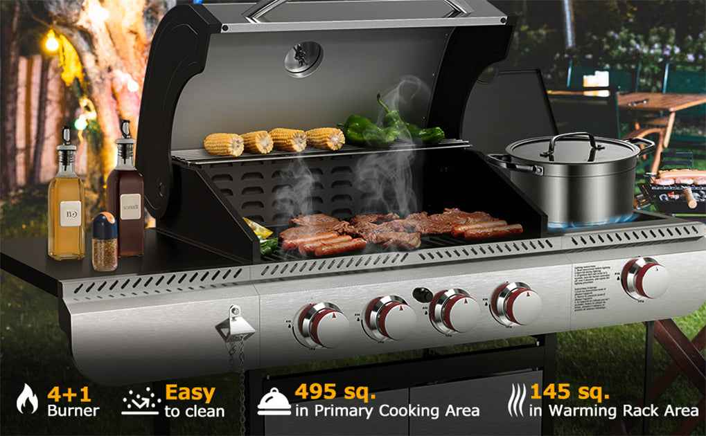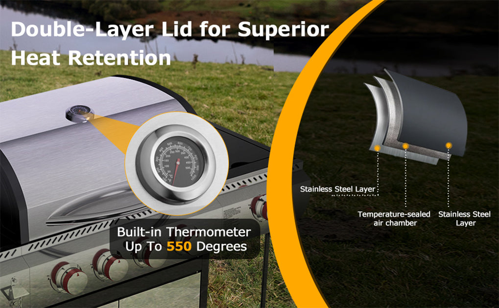 This outdoor grill features four stainless steel main burners plus one dedicated side burner, offering versatile cooking capabilities for tasks like grilling and soup-making. The total cooking area spans 545 sq. in., comprising a 400 sq. in. porcelain-enameled cast iron main cooking area and a 145 sq. in. porcelain-enameled warming rack. A thermometer mounted on the main burner lid provides precise temperature monitoring for perfect grilling results, making it ideal for both intimate gatherings and large barbecue parties.