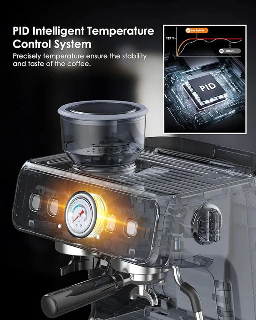 15 bar pressure, precision pid temp control, built-in grinder, milk frother, cup warmer, removable water tank, stainless steel design, 58mm commercial portafilter, semi-automatic functionality