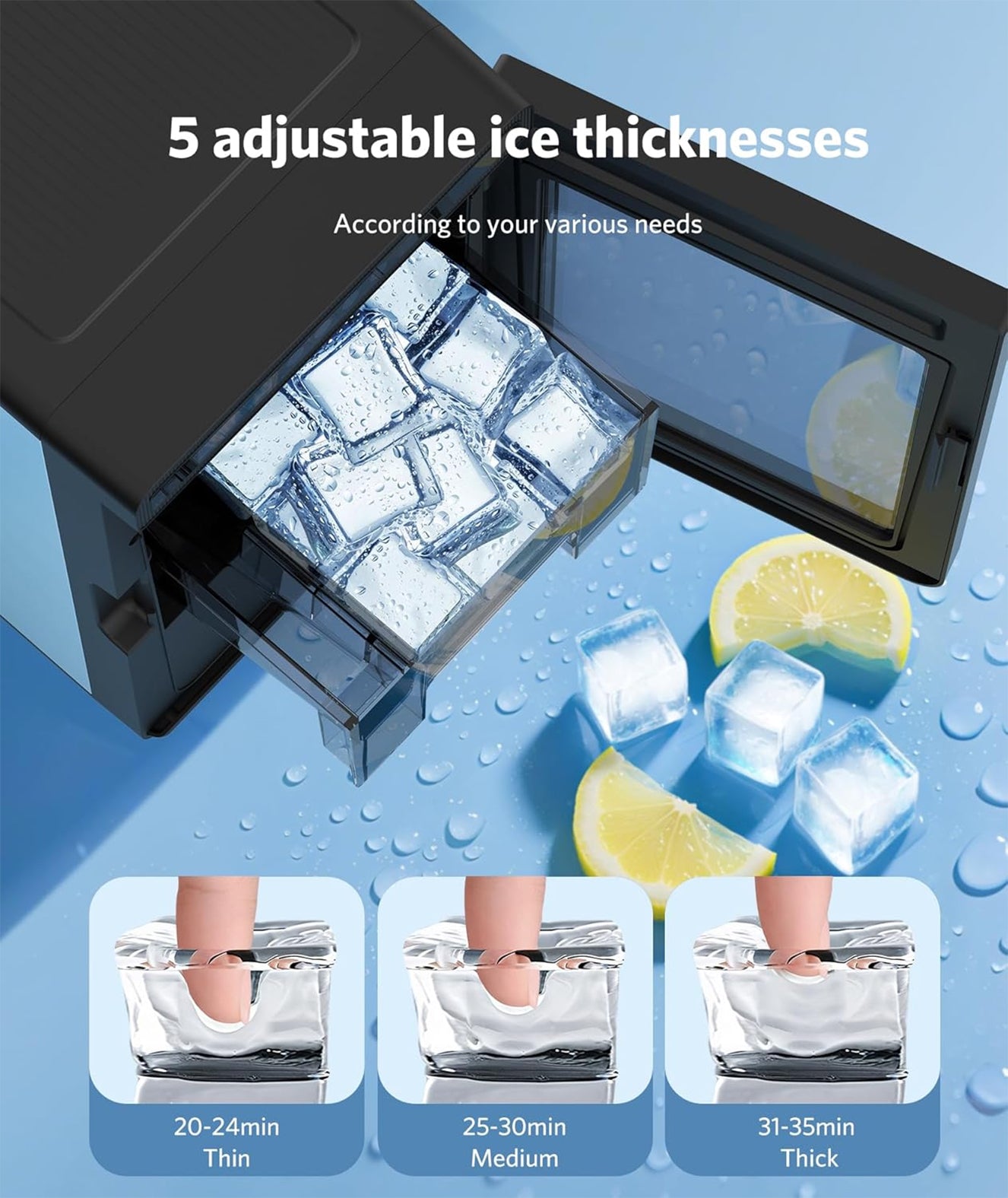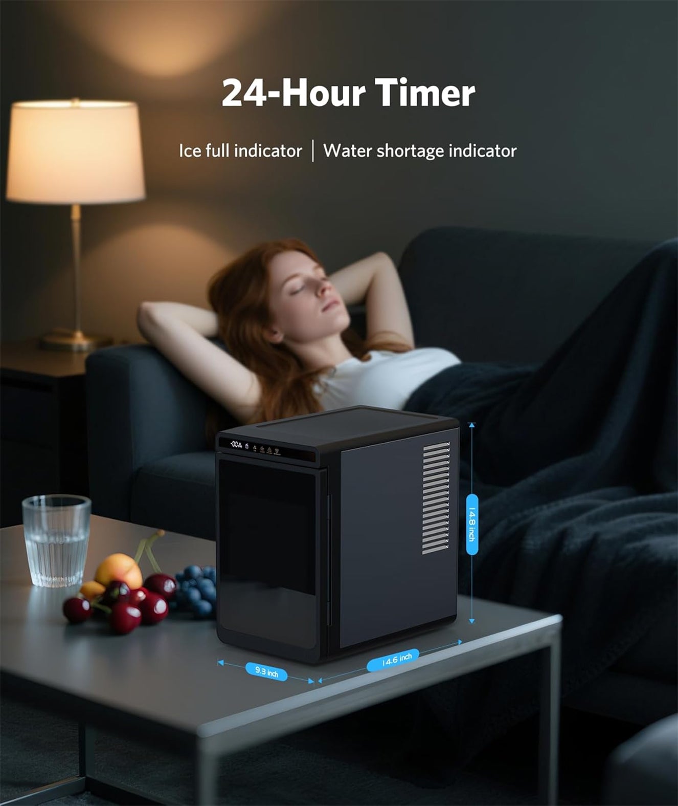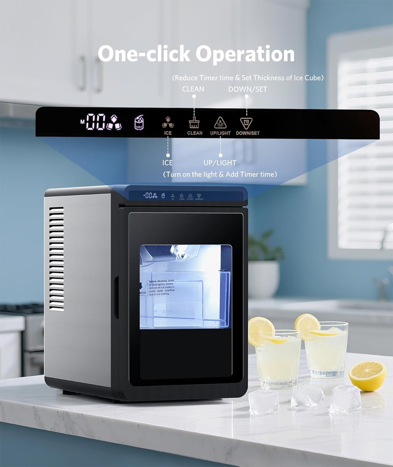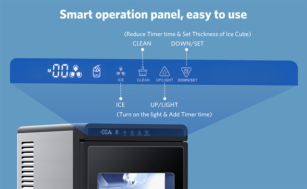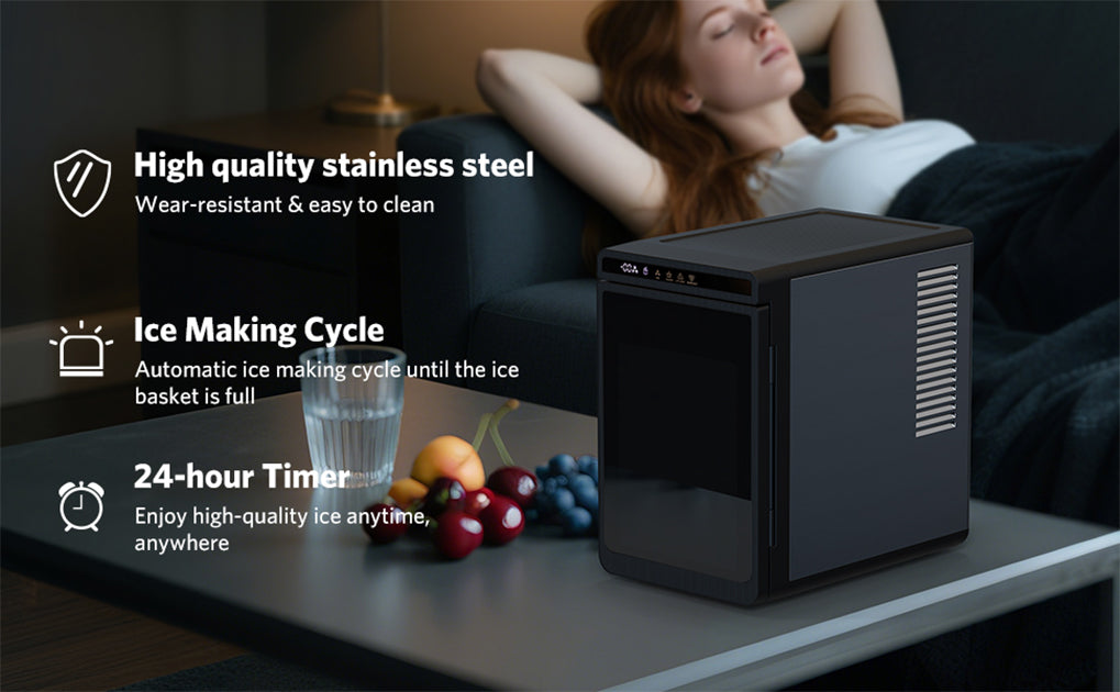 The compact ice maker operates at less than 43 decibels (quieter than a library whisper), ensuring it won't disrupt your sleep, work, or daily routines. It also features a delay start option (up to 24 hours) to perfectly fit your schedule. Enjoy high-quality ice anytime, anywhere with a simple tap on the touch panel.