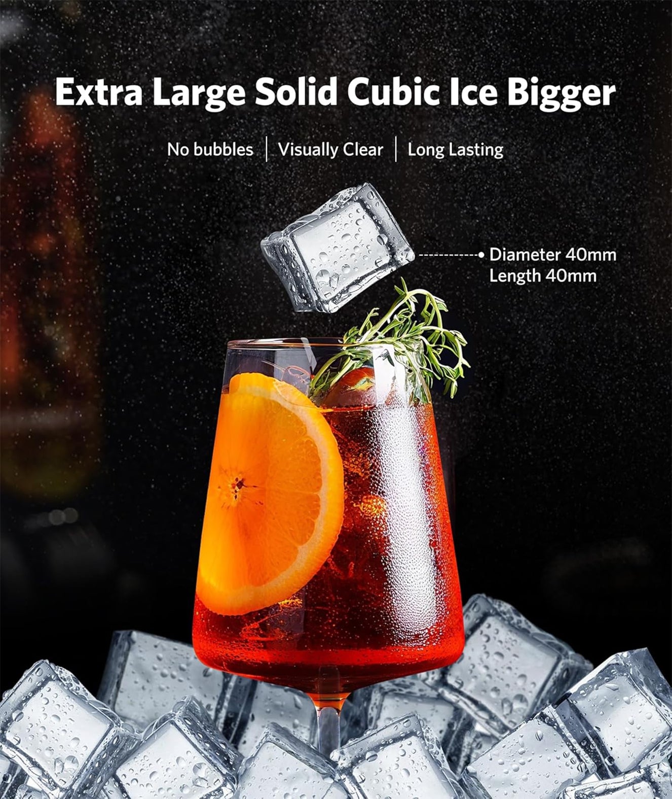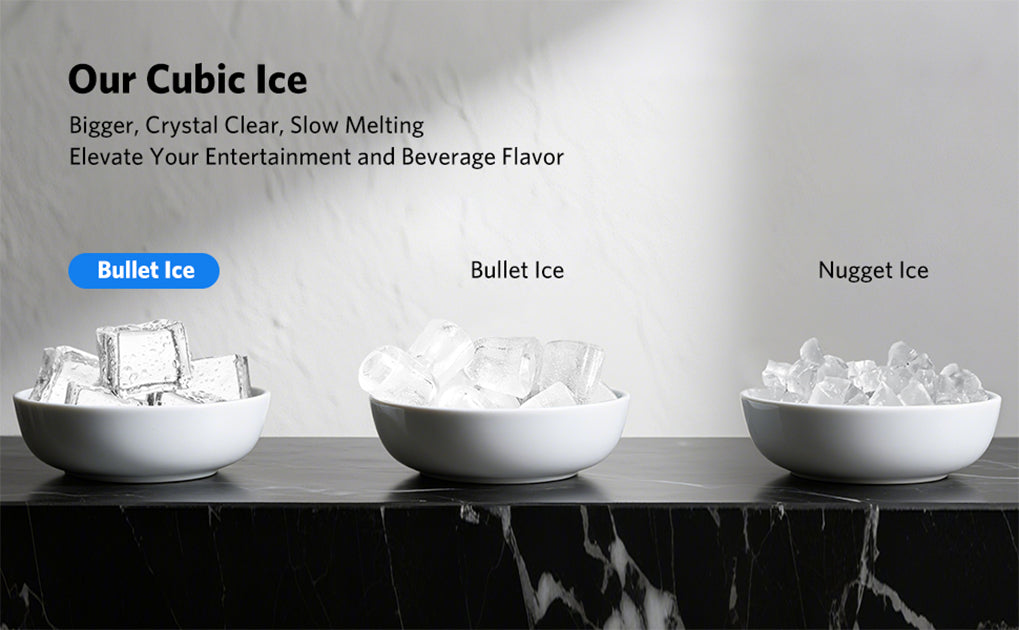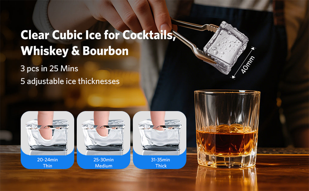The stainless steel countertop ice maker utilizes advanced CrystalFlux technology (in Crystal Mode). It produces 3 large, 1.6" flawlessly transparent ice cubes every 35 minutes. These cubes have minimal bubbles and melt slowly. Bring high-end bar sophistication home, keeping your drinks perfectly chilled without dilution for pure, unadulterated enjoyment.