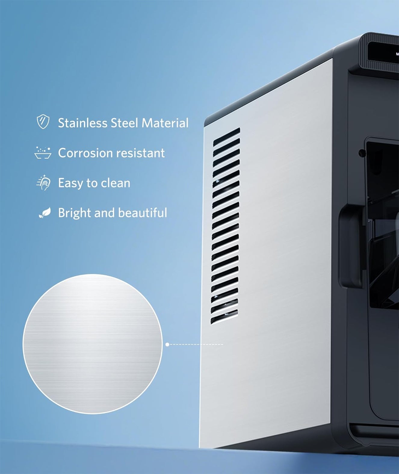 The large ice cube maker boasts an upgraded thickened stainless steel shell. This construction ensures hardness, aesthetic appeal, and resistance to deformation. It guarantees excellent corrosion resistance even in harsh environments, significantly extending the appliance's service life.
