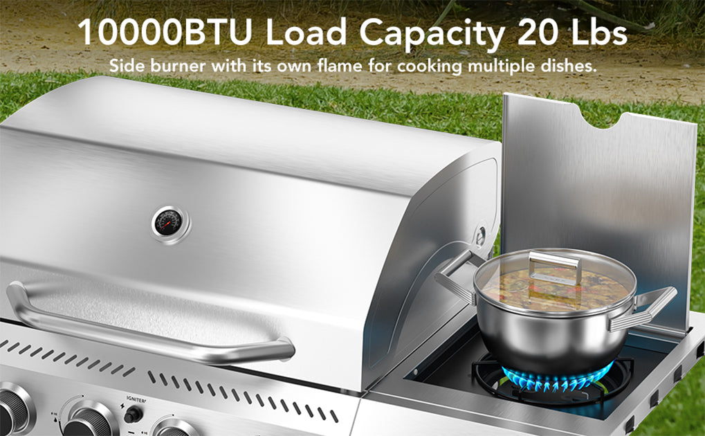 This grill is equipped with powerful burners engineered for excellent heat distribution, ensuring even cooking across the surface. Our propane gas grill features 4 main burners (each rated at 80,000 BTU) plus one covered side burner (10,000 BTU). The total output of these stainless steel burners is 42,000 BTU. Each burner is independently controlled via its own knob, allowing for precise heat management and delivering a perfect grilling experience.